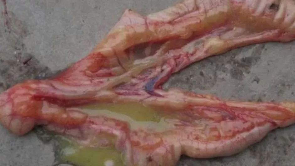 剖檢可見腸道擴張,腸內充滿液體、氣體,腸壁變薄,腸粘膜脫落,肝臟顏色變淺,有時表面有壞死灶,腎臟腫大、萎縮,顏色蒼白或有白色尿酸鹽沉積。